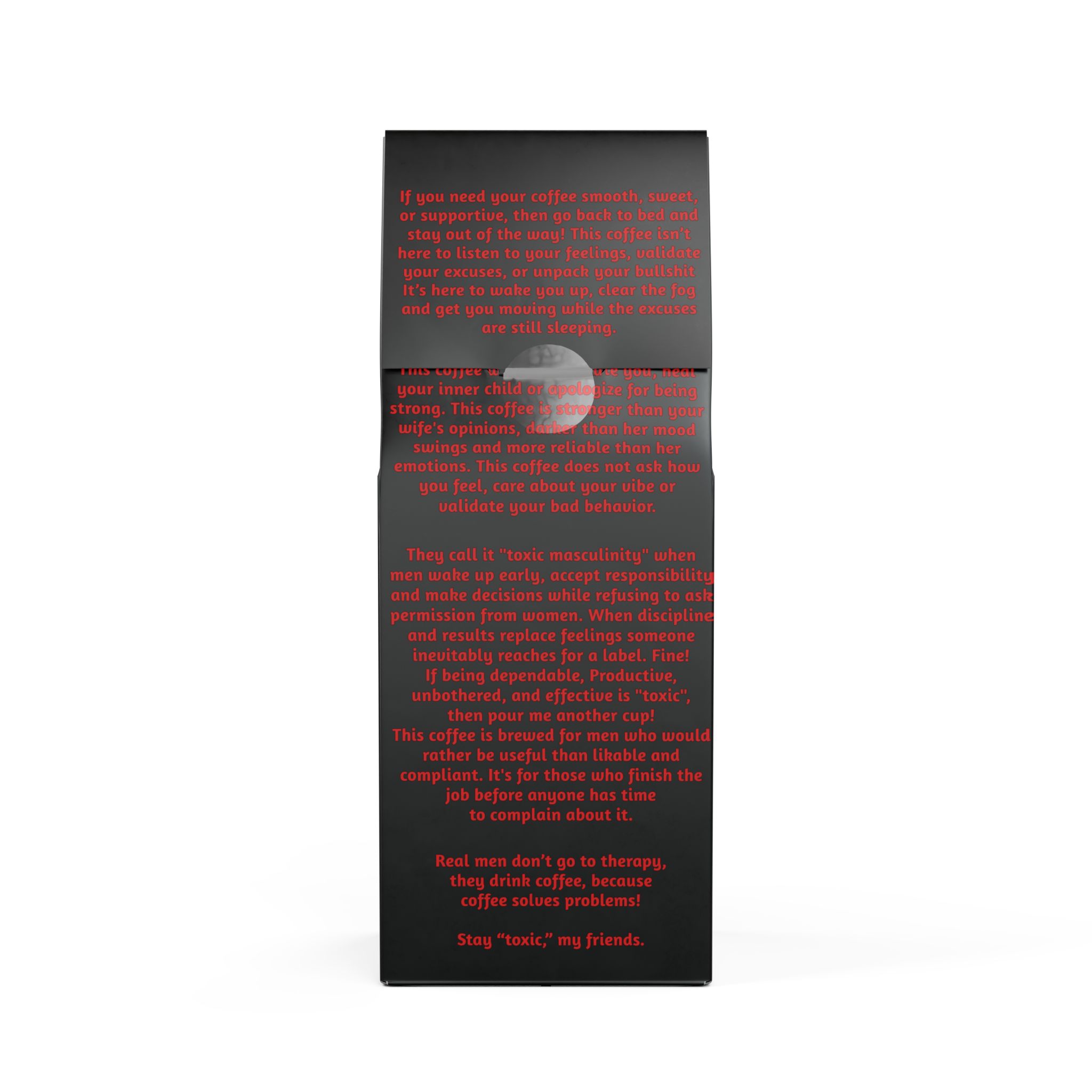 For those dark roast lovers who just want stronf black coffee. Our south American features a Dark French roast, delivering a bittersweet and toasty flavor profile with a strong finish along with rich flavors of cocoa and toasted nuts without supporting all the liberal nonsense: smooth enough to drink daily and bold enough to keep you sharp for hours.